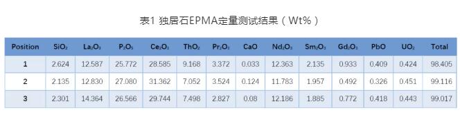 主量元素可選擇獨居石標樣,U、Th、Pb三元素推薦使用金屬U、金屬Th和PbS等標樣。其他參數可根據試樣和儀器情況實驗研究,以確認更好的測試參數。下表為某地采集的獨居石試樣,電子探針測試獲得的微區定量結果。